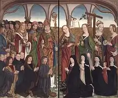 - Madone apocalyptique. Marie sur un croissant de lune brun, saluée par Dieu le Père avec des saints et la famille du comte Gumprecht II of Neuenahr (en). Tableau créé après la mort du comte en 1484. La partie centrale (128,7 × 47cm) dépasse en hauteur les parties latérales 84,2 × 179,5 cm: la photo montre le tableau dans la bibliothèque. Provient du couvent des cisterciennes de Mariengarten, Cologne. Il se trouve au Wallraf-Richartz-Museum[21]. Les apôtres et saint sont, sur la partie gauche, Georges en armure et avec bannière, Matthieu, Jacques l'Ancien, sur la partie droite André avec sa croix, Jérôme et Laurent. Les hommes en armure à gauche sont emmenés probablement par le compte, devant un prie-dieu portant le blason de la famille; à droite les femmes, emmenées probablement par l'épouse, protégée par André. Entre les deux, et sous la Madone, un paysage montrant le mont Golgotha avec les trois croix des crucifiés, entourés des personnages de la Passion, et plus en avant une Lamentation.