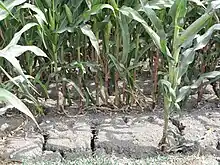 Le système racinaire du maïs est caractérisé par des racines traçantes (dites racines de surface), qui prélèvent l’eau et les nutriments nécessaires à la plante dans les couches les plus superficielles du sol[29]. Ce déséquilibre dans l’exploitation des ressources du sol fait que la plante est très exigeante en eau, ce qui peut poser problème en cas de faible disponibilité de celle-ci. Des couches de racines adventives se développent sur deux, trois ou quatre nœuds au-dessus de la surface du sol. Appelées racines coronaires, elles ont une fonction d'ancrage. La liaison entre la verse et l'enracinement d'ancrage est cependant faible, l'influence du milieu restant prépondérante malgré une variabilité génétique importante en ce qui concerne la sensibilité à la verse[30].
