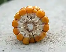 C’est la superposition des couleurs de l'albumen et de sa couche à aleurone (tissu résultant de la fécondation) et du péricarpe (tissu d'origine maternel) qui donne sa couleur finale au grain de maïs[44].