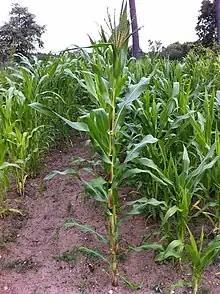 Le maïs (Zea mays L., ou Zea mays subsp. mays (autonyme)), appelé blé d’Inde au Canada[1], est une plante herbacée tropicale annuelle de la famille des Poacées (graminées), largement cultivée comme céréale pour ses grains riches en amidon, mais aussi comme plante fourragère. Le terme désigne aussi le grain de maïs lui-même.