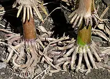 Le système racinaire comprend un très grand nombre de racines adventives qui naissent sur les nœuds situés à la base de la tige, formant des couronnes successives, tant sur les nœuds enterrés que sur les premiers nœuds aériens, dans une zone où les entrenœuds sont très courts. Ces racines forment un système fasciculé qui peut atteindre une profondeur supérieure à un mètre[28]. Ces racines d’ancrage permettent d'éviter la verse.
