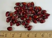 - l’enveloppe extérieure, fine membrane (incolore, rouge ou violette[43]) translucide et fibreuse, issue du péricarpe de l’ovaire (donc en réalité une partie du fruit et non pas de la graine).