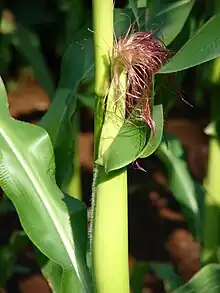L’axe de l’épi, appelé rafle, porte 10 à 20 rangées de fleurs femelles. Une seule fleur par épillet est fertile. Il est entouré de feuilles modifiées, les spathes, desséchées à maturité. À l’extrémité supérieure, les spathes laissent dépasser les stigmates filiformes très légèrement dentés aussi appelés soies. Ces soies, une par futur grain, sont plus ou moins longues selon la position du grain dans l'épi (les premières soies qui apparaissent à l’extérieur du « cornet » de spathes sont les soies qui prennent naissance à la base de l’épi) sont les styles récepteurs du pollen sur toute leur longueur car recouverts de poils collants. Tout grain de pollen peut y germer pendant les 6 à 20 jours qui suivent leur apparition. Ces styles peuvent être colorés diversement en fonction des variétés (le plus souvent, blond virant au brun).