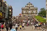 En plus d'être un comptoir commercial, Macao joue un rôle central dans les échanges culturels entre Européens, Chinois et Japonais et dans la propagation du catholicisme en Asie, devenant un haut lieu de formation de missionnaires pour la Chine et le Japon. Les premiers sont envoyés par la couronne portugaise sous le système du Padroado et le pape Grégoire XIII crée en 1576 le diocèse de Macao qui couvre alors la Chine, la Corée, le Japon et le Viêt Nam[56]. Les jésuites établissent une école où Michele Ruggieri et Matteo Ricci apprennent le chinois avant de créer la première mission jésuite en Chine en 1582. Celle-ci devient en 1594 la première institution universitaire de type occidental en Orient[57], le collège Saint-Paul. Des missionnaires franciscains[alpha 17], dominicains[alpha 18] et augustins[alpha 19] s'installent à Macao entre 1579 et 1587[alpha 20]. Un des fruits des échanges artistiques et culturels en place à cette époque peut se voir de nos jours : la façade de l'église de la Mère-de-Dieu, connue sous le nom de ruines de Saint-Paul. Construite de 1602 à 1640 selon les plans d'un architecte génois, Carlo Spinola, la façade est sculptée par des artisans japonais, chrétiens convertis qui fuient les persécutions, et intègre des éléments orientaux et européens : le lion chinois, le chrysanthème japonais et la caravelle portugaise.