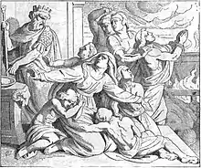 Dans la tradition chrétienne, le nom des Maccabées évoque tout particulièrement les sept fils et leur mère, dont le martyre est rapporté au chapitre 7 du deuxième Livre des Maccabées. Selon Paul Perdrizet[2], le récit relatif aux Sept-Saints Maccabées provient d'Orient où il est encore très répandu, avant d'être diffusé en Occident au Moyen Âge. Le récit rapporte comment sept jeunes juifs, n'ayant pas voulu manger de viande de porc, interdite par la Torah, furent mis à mort sur ordre du roi séleucide Antiochos IV Épiphane.