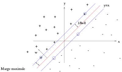 La première idée clé est la notion de marge maximale. La marge est la distance entre la frontière de séparation et les échantillons les plus proches. Ces derniers sont appelés vecteurs supports. Dans les SVM, la frontière de séparation est choisie comme celle qui maximise la marge[note 2],[10]. Le problème est de trouver cette frontière séparatrice optimale, à partir d'un ensemble d'apprentissage. Ceci est fait en formulant le problème comme un problème d'optimisation quadratique, pour lequel il existe des algorithmes connus.