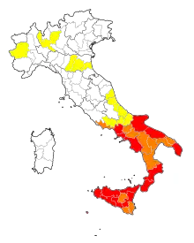 L'infiltration mafieuse dans l'économie des provinces italiennes par le prélèvement du pizzo: rouge (pizzo courant), orange (pizzo occasionnel), jaune (pizzo peu pratiqué).