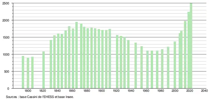 | L'évolution du nombre d'habitants est connue à travers les recensements de la population effectués dans la commune depuis 1793. Pour les communes de moins de 10 000 habitants, une enquête de recensement portant sur toute la population est réalisée tous les cinq ans, les populations légales des années intermédiaires étant quant à elles estimées par interpolation ou extrapolation[25]. Pour la commune, le premier recensement exhaustif entrant dans le cadre du nouveau dispositif a été réalisé en 2008[26]. En 2021, la commune comptait 2 493 habitants[Note 6], en augmentation de 22,51 % par rapport à 2015 (Landes : +4,9 %, France hors Mayotte : +1,84 %). |