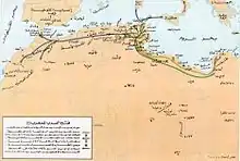 Carte montrant le déroulement de la campagne islamique contre la prêtresse et les conquêtes de Musa bin Nusayr et de ses fils dans le Maghreb central et lointain et dans les îles de la Mer Méditerranée.