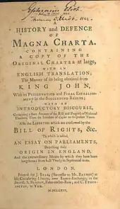 - Magna charta, cum statutis, tum antiquis, tum recentibus., Stationers' Company, Londres, 1618, 258 f.