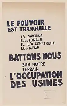 Au petit jour, 500 métallos de l'usine Claas de Woippy (Moselle)[39], débraient, relayés quelques heures plus tard par les ouvriers de l'usine Sud-Aviation à Bouguenais, qui est la première usine occupée[39], en référence aux occupations de 1936. Puis, la grève s'étend petit à petit à tout le pays. L'appel également lancé de la Sorbonne le par le comité d'occupation pour l'occupation immédiate de toutes les usines en France et la formation des conseils ouvriers suscite les craintes des autorités (communiqué de 19 heures de Pompidou).