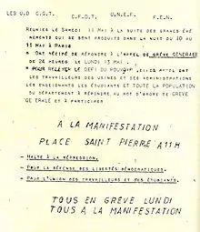 Le , la CGT lance un appel à la grève générale pour le lendemain[32]. L'avant-veille, soir du , le magazine télévisé Panorama, présentant ce qui se passait depuis le début du mois de mai, avait été censuré. Le samedi, les personnels de l'ORTF s'insurgent contre cette censure par un communiqué à l'AFP, le jour où les images sur les violences policières de la nuit de vendredi à samedi ont "bouleversé la France entière" ou presque, rappelle l'historienne Michelle Zancarini-Fournel[32]. L'appel de la CGT est repris par les étudiants, la SNESup, un syndicat enseignant, la CFDT et la FEN (Fédération de l'Education Nationale) et Force Ouvrière[32]. "Les appels syndicaux à la grève générale de vingt-quatre-heures insistent tous sur la solidarité entre étudiants et ouvriers : là où deux mondes demeuraient le plus souvent séparés, la violence policière vient les rapprocher", selon l'historienne Ludivine Bantigny dans son livre 1968[32].