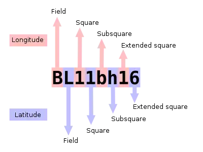 Par exemple, la tour Eiffel, qui se trouve en longitude 2.2946 est (2° 17' 40" E), latitude 48.8587 nord (48° 51' 31" N) est localisée en JN18du. La longitude est 'J':(10*20)-180 + '1':1*2 (2 degrés est) + 'd':3*5' (15 minutes d'arc); la latitude est 'N':(13*10)-90 + '8':8 (48 degrés nord) + 'u':20*2,5 (50 minutes d'arc) (à vérifier).