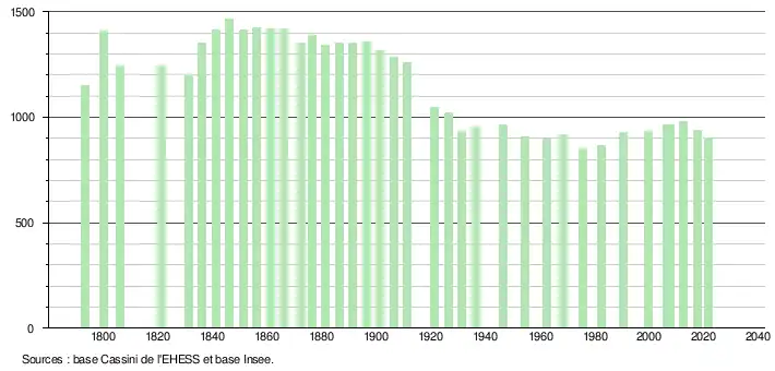 L'évolution du nombre d'habitants est connue à travers les recensements de la population effectués dans la commune depuis 1793. Pour les communes de moins de 10 000 habitants, une enquête de recensement portant sur toute la population est réalisée tous les cinq ans, les populations légales des années intermédiaires étant quant à elles estimées par interpolation ou extrapolation[15]. Pour la commune, le premier recensement exhaustif entrant dans le cadre du nouveau dispositif a été réalisé en 2007[16].