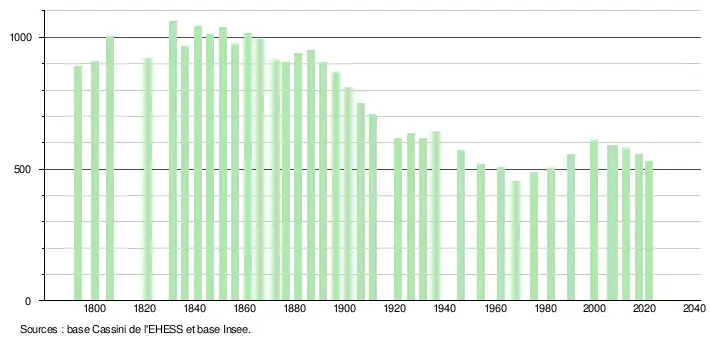 L'évolution du nombre d'habitants est connue à travers les recensements de la population effectués dans la commune depuis 1793. Pour les communes de moins de 10 000 habitants, une enquête de recensement portant sur toute la population est réalisée tous les cinq ans, les populations légales des années intermédiaires étant quant à elles estimées par interpolation ou extrapolation[19]. Pour la commune, le premier recensement exhaustif entrant dans le cadre du nouveau dispositif a été réalisé en 2007[20].