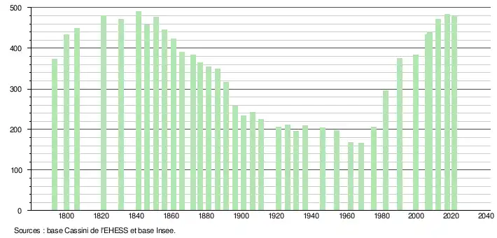 L'évolution du nombre d'habitants est connue à travers les recensements de la population effectués dans la commune depuis 1793. Pour les communes de moins de 10 000 habitants, une enquête de recensement portant sur toute la population est réalisée tous les cinq ans, les populations légales des années intermédiaires étant quant à elles estimées par interpolation ou extrapolation[36]. Pour la commune, le premier recensement exhaustif entrant dans le cadre du nouveau dispositif a été réalisé en 2007[37].