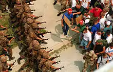 Marines américains entraînés au maintien de l’ordre par la gendarmerie française en . Les militaires engagés dans des opérations de guerre asymétrique ou d'aide humanitaire doivent souvent réagir à des mouvements de foules.