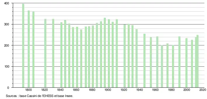 L'évolution du nombre d'habitants est connue à travers les recensements de la population effectués dans la commune depuis 1793. À partir du , les populations légales des communes sont publiées annuellement dans le cadre d'un recensement qui repose désormais sur une collecte d'information annuelle, concernant successivement tous les territoires communaux au cours d'une période de cinq ans. Pour les communes de moins de 10 000 habitants, une enquête de recensement portant sur toute la population est réalisée tous les cinq ans, les populations légales des années intermédiaires étant quant à elles estimées par interpolation ou extrapolation[36]. Pour la commune, le premier recensement exhaustif entrant dans le cadre du nouveau dispositif a été réalisé en 2006[37],[Note 1].