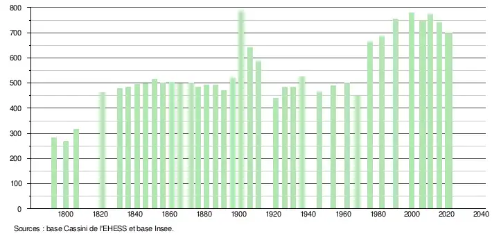 L'évolution du nombre d'habitants est connue à travers les recensements de la population effectués dans la commune depuis 1793. Pour les communes de moins de 10 000 habitants, une enquête de recensement portant sur toute la population est réalisée tous les cinq ans, les populations légales des années intermédiaires étant quant à elles estimées par interpolation ou extrapolation[19]. Pour la commune, le premier recensement exhaustif entrant dans le cadre du nouveau dispositif a été réalisé en 2005[20].