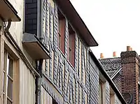 La maison citadine, quant à elle, est bien représentée dans une ville comme Rouen qui recèle des maisons de référence, dont les structures font essentiellement appel aux poteaux verticaux longs et rapprochés, technique des débuts du colombage[21].