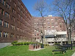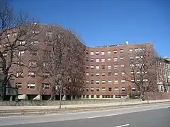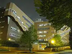 Les façades nord et sud sont très différentes en raison de l'emplacement du terrain[8]. Le côté sud, face à la rivière Charles, est sinueux et continu. Il compte sept étages[8]. Le côté nord est, au contraire, un ensemble abrupt de volumes droits, défini par l'escalier extérieur fermé qui tombe en cascade de l'extérieur et sert de point de vue[4],[8],[6]. La façade brise la monotonie du reste des bâtiments universitaires, dans un style néoclassique et rationaliste[9].