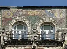 L'importante loggia occupe le centre de l'immeuble. Elle a la particularité de posséder des baies trapézoïdales. Elle est surmontée d'un balcon en fer forgé aux motifs géométriques. Une autre mosaïque se trouvant à l'allège des baies de la loggia fait figurer une bombe et les flammes qui en sortent.