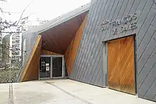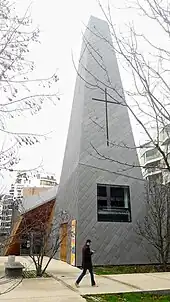 Le bâtiment de 1 150 m2 est conçu comme un origami de zinc gris, patiné et plié, enveloppant un patio central qui apporte la lumière. Il comprend un grand espace modulaire pouvant accueillir des spectacles ou des offices religieux et des salles d'accueil pour les familles. Il est surmonté d'un clocher orné de fines fentes en forme de croix, évoquant une église[1].