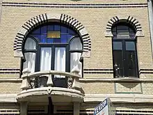 Cinq baies vitrées du rez-de-chaussée et du premier étage forment des arcs outrepassés composés de briques blanches et bleues en alternance ainsi que de clés de voûte et de claveaux en pierre blanche sculptée. Toutes les impostes des baies sont constituées de vitraux de teintes bleues ou jaunes. Un larmier est présent sous chaque baie.