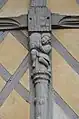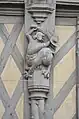 La façade en pan de bois, est décorée de nombreuses sculptures est constituée d'un panneautage à losange dont les hourdis étaient, à l'origine, constitués de briques[2].