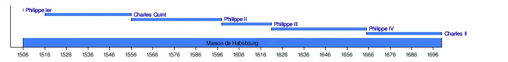 ![]() | Philippe Ier | - (2 mois et 13 jours) | Fils de l'empereur du Saint-Empire romain germanique Maximilien Ier de Habsbourg et de la duchesse Marie de Bourgogne, il épouse l'héritière des royaumes des Castille et d'Aragon, Jeanne la Folle. Il est élu roi par les Cortes en 1506 (conjointement avec son épouse) et fonde la dynastie des Habsbourg en Espagne. |