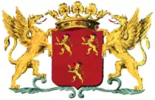 | Blasonnement | « De gueules, à trois lions d'or, armés, lampassés et couronnés d'azur. » |