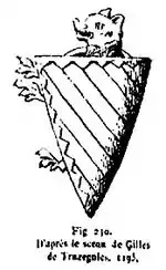 - Gilles Ier de Trazegnies (° 1134 - † 1161) qui épouse Gerberge de Landen[7] est le premier seigneur de Trazegnies à part entière. Tombé en contradiction avec l'Abbaye de Floreffe, il fut excommunié trois fois et commit plusieurs malveillances à l'encontre des moines. Les seigneurs des environs furent excédés par son comportement et ses actes et firent le siège de son château. Il fut tué sur ses propres remparts. Son frère, Anselme[8], seigneur de Péronnes-lez-Binche, chanoine et trésorier du chapitre collégial de Soignies, fonde l'abbaye de Cambron en 1148.