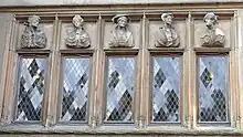 Elle se nomme ainsi du fait des cinq têtes sculptées dans la pierre, trois hommes et deux femmes, dont on ignore l’identité, probablement des personnages célèbres de l’histoire messine. Ces têtes sont des copies, les originaux étant visibles au musée pour quatre d’entre elles, tandis que la cinquième est au musée des beaux-arts de Boston[3]. La tourelle d’escalier et le tympan (porte d’entrée) sont décorés d’un haut-relief représentant une chasse au lion.