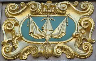 La façade est couronnée par un pignon à volutes de deux registres[5] comportant trois travées et trois fenêtres. Au registre inférieur, la travée centrale comprend une fenêtre à piédroits et impostes saillants portant un arc en plein cintre à clef saillante, surmonté d'un larmier courbe[5] mouluré à clé dorée, tandis que les travées latérales sont occupées chacune par une petite fenêtre et une petite baie aveugle. Le registre supérieur est percé d'un œil-de-bœuf ovale[5] surmonté d'un larmier et est orné de volutes, de boules dorées, de guirlandes de fleurs dorées. Ce pignon est sommé d'un larmier courbe surmonté d'un vase en pierre.