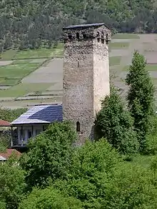 La Svanétie, région montagneuse de la Géorgie, possède un nombre important de ce type de tours fortifiées, les tours svanes, nommées koshki, très élevées, de plan carré, à rez-de-chaussée aveugle, auxquelles on accédait par une échelle, et qui servait d'abri à une famille pendant une longue durée.