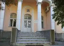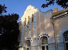 La façade principale est décorée de motifs Sécession ; elle se présente comme une structure symétrique avec des avancées latérales demi-circulaires et une partie centrale abritant l'entrée et un porche avec deux colonnes et deux demi-colonnes qui supportent des arcs ; un pignon à volutes couronne la partie centrale, décoré par quatre bandes verticales en céramique émaillées avec des motifs de tulipes[1]. Les fenêtres se terminent de façon elliptique et elles sont encadrées de pilastres moulurés surmontés de chapiteaux dotés de motifs floraux. Les arcs du porche et ceux situés au-dessus de certaines fenêtres sont ornés de plaques de céramique bleue[1].
