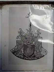 Description des armoiries de Maissin: De sable à un navire d'or, équipé d'argent, le mât surmonté d'une couronne d'or à neuf perles. L'écu somme d'un heaume d'argent, couronné, grillé, colleté et liseré d'or, doublé de gueules, aux lambrequins d'or et de sable. Cimier: un lion issant d'or tenant une croix écotée de gueules. Supports: deux léopards d'or. Le tout placé devant l'ancien calvaire dit de Croas-tyru au Tréhou (Finistère) actuellement au cimetière français de Maissin, au naturel.