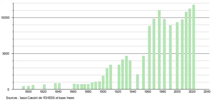 - Par convention dans Wikipédia, le principe a été retenu de n’afficher dans le tableau des recensements et le graphique, pour les populations légales postérieures à 1999, que les populations correspondant à une enquête exhaustive de recensement pour les communes de moins de 10 000 habitants, et que les populations des années 2006, 2011, 2016, etc. pour les communes de plus de 10 000 habitants, ainsi que la dernière population légale publiée par l’Insee pour l'ensemble des communes.