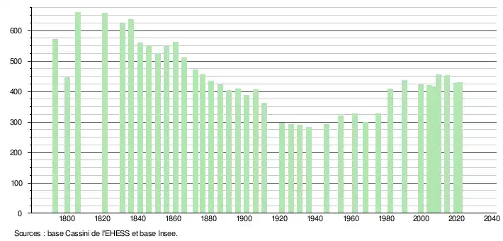L'évolution du nombre d'habitants est connue à travers les recensements de la population effectués dans la commune depuis 1793. Pour les communes de moins de 10 000 habitants, une enquête de recensement portant sur toute la population est réalisée tous les cinq ans, les populations légales des années intermédiaires étant quant à elles estimées par interpolation ou extrapolation[16]. Pour la commune, le premier recensement exhaustif entrant dans le cadre du nouveau dispositif a été réalisé en 2004[17].