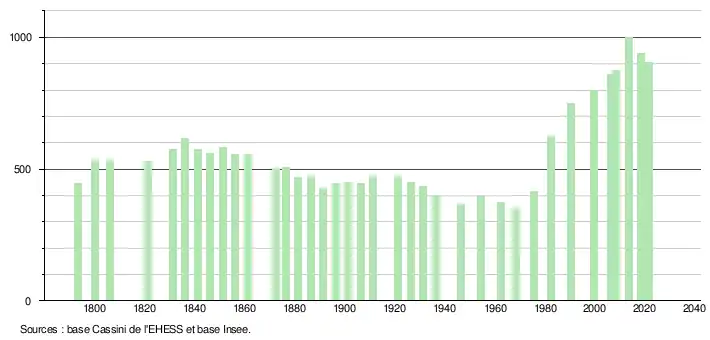 L'évolution du nombre d'habitants est connue à travers les recensements de la population effectués dans la commune depuis 1793. Pour les communes de moins de 10 000 habitants, une enquête de recensement portant sur toute la population est réalisée tous les cinq ans, les populations légales des années intermédiaires étant quant à elles estimées par interpolation ou extrapolation[17]. Pour la commune, le premier recensement exhaustif entrant dans le cadre du nouveau dispositif a été réalisé en 2008[18].