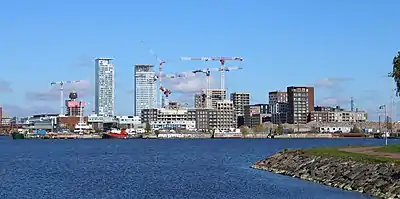 Travaux de construction à Sompasaari et Kalasatama vus de Tervasaari en octobre 2020. La plupart des chantiers de construction au premier plan sont à Sompasaari, l'arrière-plan est à Kalasatama. Les tours sont Majakka (à gauche), et Loisto, qui est encore en construction au moment où la photo a été prise.