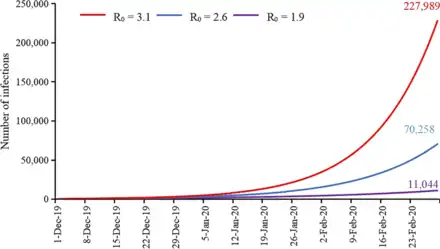 Selon de premiers travaux de recherche, le taux de reproduction de base (noté R0) qui est un indice de contagiosité se situerait entre 2,2 et 3,5[80],[100]. Il est de 2,2 (intervalle de confiance 95 %, de 1,4 à 3,9) sur les 425 premiers cas confirmés[80].