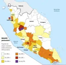 Le nom de « Malaisie » vient de « Malais », qui désigne le groupe ethnique majoritaire (62 %) du pays. Les Malais ne sont pas les uniques citoyens de la fédération. Il y a environ 25 % de Malaisiens d'origine chinoise et 10 % d'origine indienne, dont les ancêtres se sont établis il y a plusieurs générations[42]. Il y a, en outre, les « Orang Asli » (populations autochtones). L'origine ethnique des citoyens, malaise, chinoise, tamoule et autres est mentionnée sur la carte d'identité et le passeport. On trouve des minorités eurasiennes à Kuala Lumpur, Malacca et Penang.