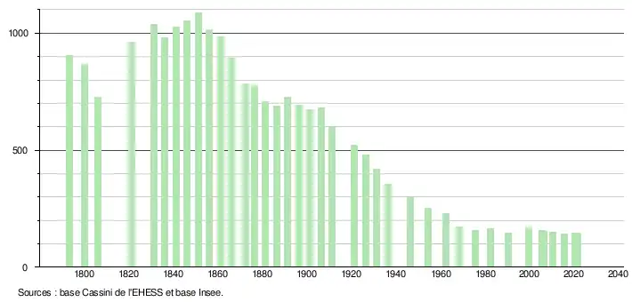 L'évolution du nombre d'habitants est connue à travers les recensements de la population effectués dans la commune depuis 1793. Pour les communes de moins de 10 000 habitants, une enquête de recensement portant sur toute la population est réalisée tous les cinq ans, les populations légales des années intermédiaires étant quant à elles estimées par interpolation ou extrapolation[22]. Pour la commune, le premier recensement exhaustif entrant dans le cadre du nouveau dispositif a été réalisé en 2005[23].