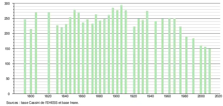 L'évolution du nombre d'habitants est connue à travers les recensements de la population effectués dans la commune depuis 1793. À partir du , les populations légales des communes sont publiées annuellement dans le cadre d'un recensement qui repose désormais sur une collecte d'information annuelle, concernant successivement tous les territoires communaux au cours d'une période de cinq ans. Pour les communes de moins de 10 000 habitants, une enquête de recensement portant sur toute la population est réalisée tous les cinq ans, les populations légales des années intermédiaires étant quant à elles estimées par interpolation ou extrapolation[3]. Pour la commune, le premier recensement exhaustif entrant dans le cadre du nouveau dispositif a été réalisé en 2004[4],[Note 1].
