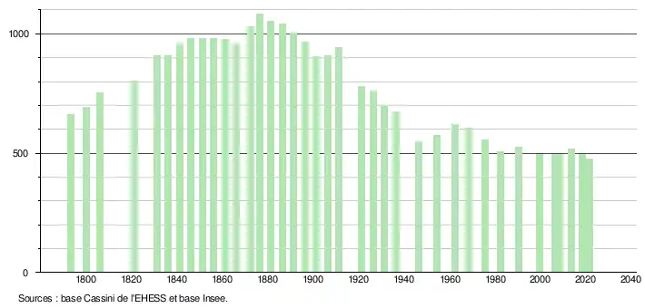 L'évolution du nombre d'habitants est connue à travers les recensements de la population effectués dans la commune depuis 1793. Pour les communes de moins de 10 000 habitants, une enquête de recensement portant sur toute la population est réalisée tous les cinq ans, les populations légales des années intermédiaires étant quant à elles estimées par interpolation ou extrapolation[18]. Pour la commune, le premier recensement exhaustif entrant dans le cadre du nouveau dispositif a été réalisé en 2008[19].
