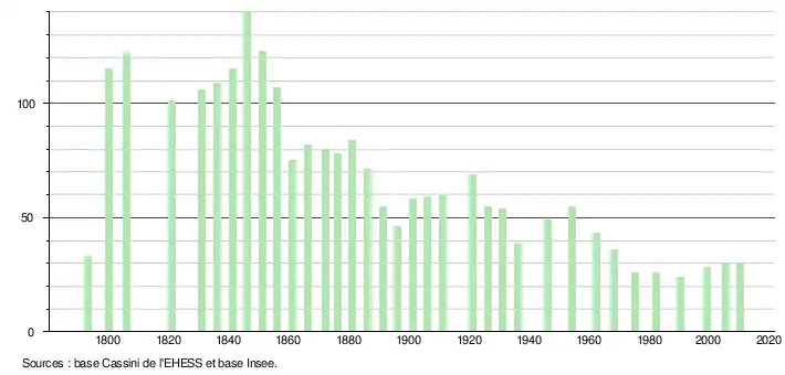 - Dans le tableau des recensements et le graphique, par convention dans Wikipédia, le principe a été retenu, pour les populations légales postérieures à 1999 de n’afficher dans le tableau des recensements et le graphique que les populations correspondant à l'année 2006, première population légale publiée calculée conformément aux concepts définis dans le décret no 2003-485 du 5 juin 2003, et les années correspondant à une enquête exhaustive de recensement pour les communes de moins de 10 000 habitants, ainsi que la dernière population légale publiée par l’Insee.