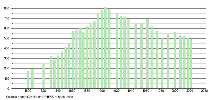 L'évolution du nombre d'habitants est connue à travers les recensements de la population effectués dans la commune depuis 1800. Pour les communes de moins de 10 000 habitants, une enquête de recensement portant sur toute la population est réalisée tous les cinq ans, les populations légales des années intermédiaires étant quant à elles estimées par interpolation ou extrapolation[24]. Pour la commune, le premier recensement exhaustif entrant dans le cadre du nouveau dispositif a été réalisé en 2007[25].