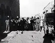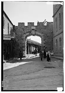 La rue de Jaffa s'agrémente d'arbres (aux plants venus de Jericho), et des premiers éclairages et poubelles publics. Une grande horloge baroque (1901)[34] - que les Britanniques retireront en 1924 - en l'honneur du sultan Abdul Hamid II[N 8] et un théâtre municipal se plantent, l'un au-dessus et l'autre en face de la porte de Jaffa[20]. Pour y mieux accueillir les touristes et les pèlerins dont la venue s'est intensifiée à partir des années 1880[11] grâce à l'incitation touristique, le centre YMCA et les luxueux hôtels Palace et King David voient concomitamment le jour au tout début des années 1930, ainsi qu'une zone commerciale plus structurée à l'extérieur de la porte de Jaffa, près de laquelle s'installent aussi d'autres services touristiques pour le gîte et les circuits de visite, et des boutiques de souvenirs de la ville sainte.