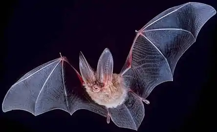Sur l'ensemble du Mésozoïque, on n'avait recensé jusqu'à la fin du XXe siècle que 150 à 300 espèces de mammifères, regroupées dans 27 familles, dont une dizaine de familles de marsupiaux, et une dizaine de placentaires[23]. Après la disparition des dinosaures lors de l'extinction Crétacé-Paléogène, les mammifères placentaires et marsupiaux ont connu une radiation évolutive majeure. Parmi les placentaires, les chiroptères ont développé leur propre voie évolutive en adoptant ailes et système d'écholocalisation.